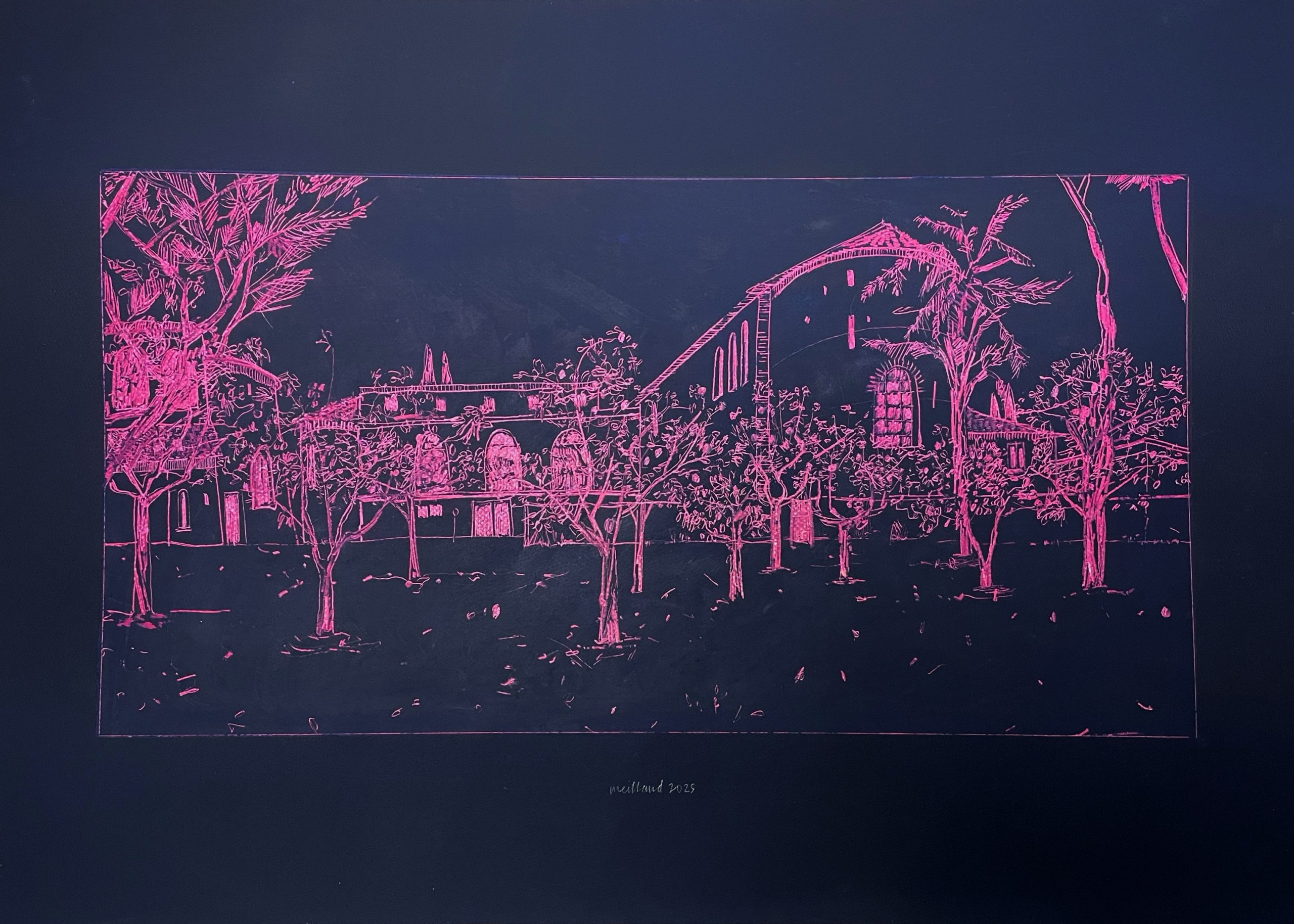 Pastel gras, gouache, et acrylique sur contrecollé 1,5mm d’épaisseur. Avec cadre en métal noir brillant, 50x70cm.